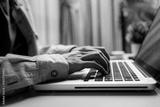 Hands typing on laptop keyboard. Professional man working on computer at desk. Freelance, remote work, program coding, research marketing, search data and digital nomad concept