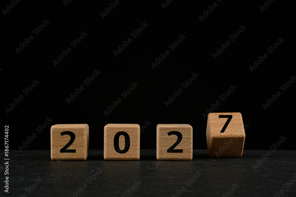 2027 en texto sobre cubos de madera sobre fondo negro
