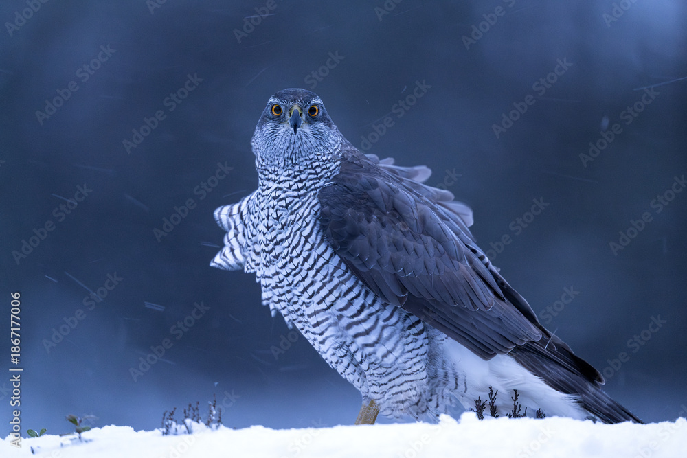 Northern goshawk on snow at dawn with snowy forest background