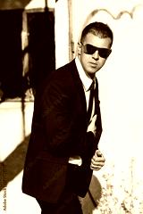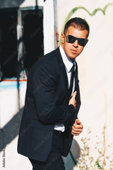 Handsome man in black suit and sunglasses. Secret agent, mafia, bodyguard concept.