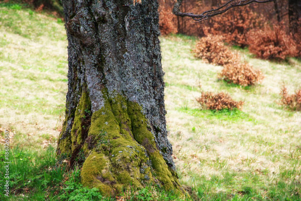 View of mysterious big tree with green moss in a deep green. Calm and wild nature concept. Forest landscape. Nature background.