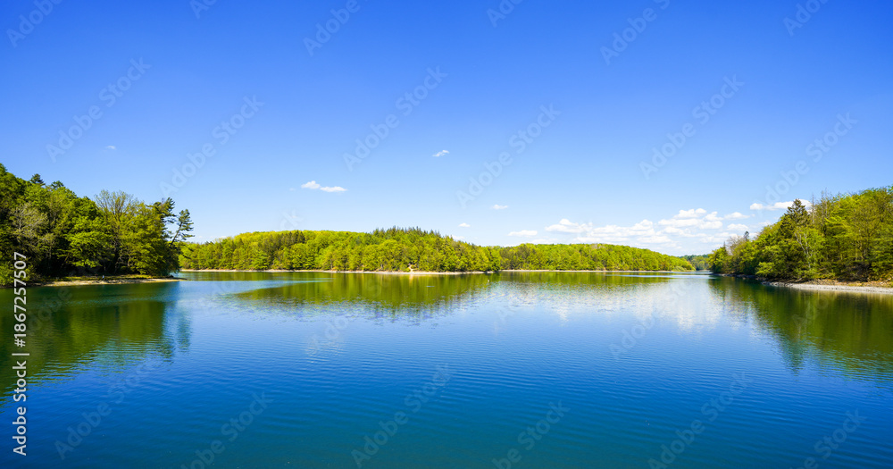View from the Neye Dam of the surrounding landscape near Wipperfürth. Nature at the reservoir.