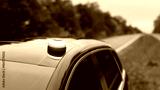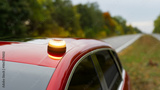 Beacon V16 amber emergency light on a red car parked roadside, with a blurred forest and highway, conveying safety, roadside assistance, and emergency readiness in realistic 3D
