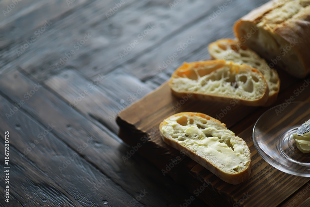 Freshly Baked Bread Slices with Butter on Wooden Cutting Board