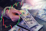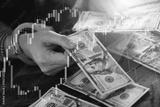 women's handcuffed hands hold dollars. handcuffed hands on a money banknotes background.