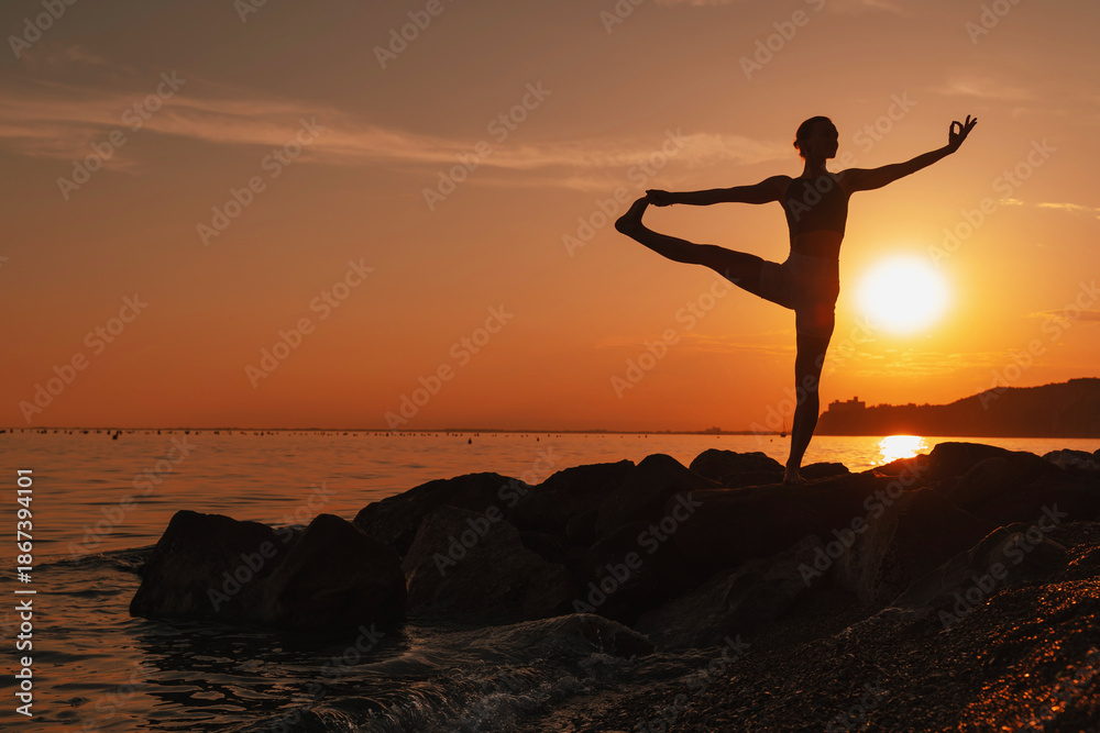 Woman practicing yoga at seaside at sunset or sunrise. Holistic Health and Mental Well-Being.