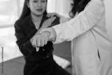 Female doctor examining the arm of a young female patient during a medical consultation in a hospital room, diagnosis and treatment for potential injury or pain.