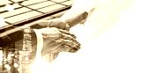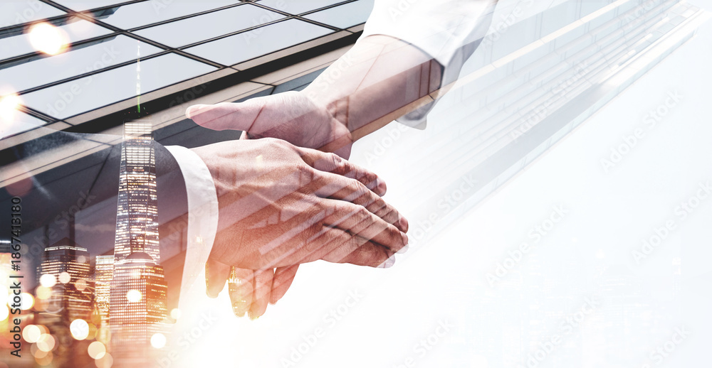 Two people shaking hands over a city skyline and modern glass building background, symbolizing business partnership and corporate collaboration concept