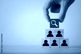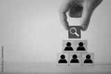 Hand selecting search icon above people blocks representing talent search recruitment employee selection hiring process and workforce management in business for human resource concept.