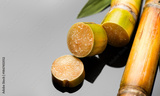 Sugar cane stalks and leaves, sugarcane sticks on black background. Organic Saccharum Officinarum plant flat lay, horizontal photo, border design
