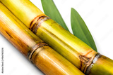 Sugar cane stalks and leaves, sugarcane sticks isolated on white background. Organic Saccharum Officinarum plant flat lay, border design.