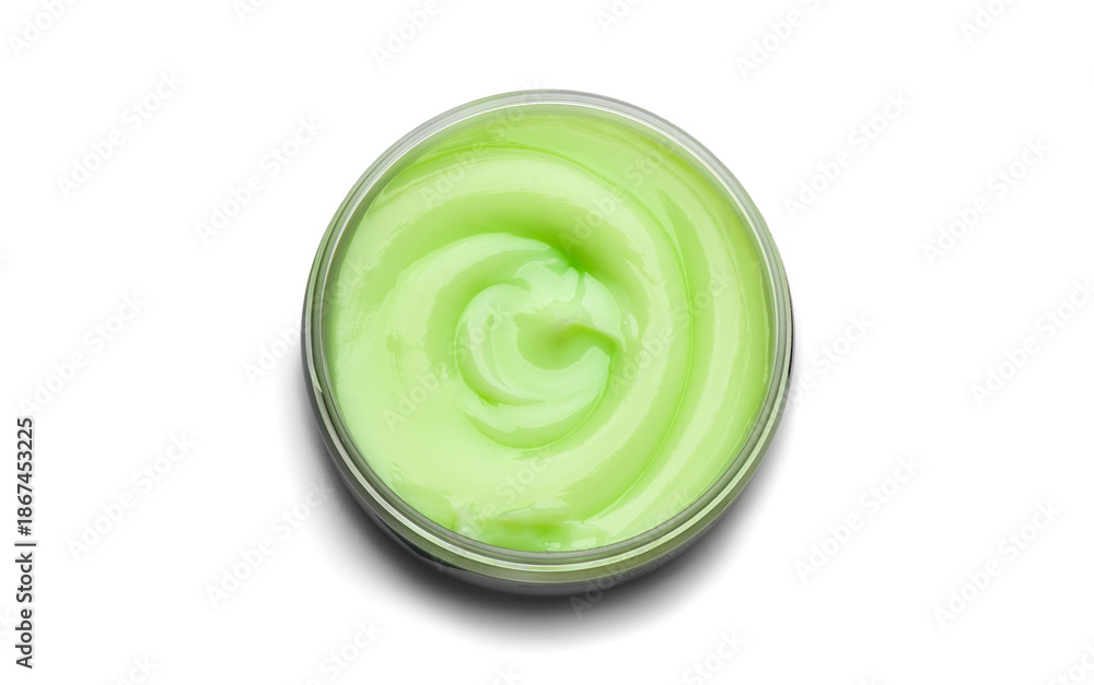 Jar of cosmetic cream, natural cosmetics, face, body green moisturizer, skin care, hydrating hair vegan mask isolated on white background, aloe vera cosmetic product, top view, from above