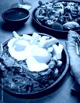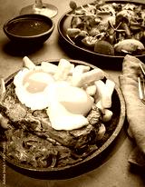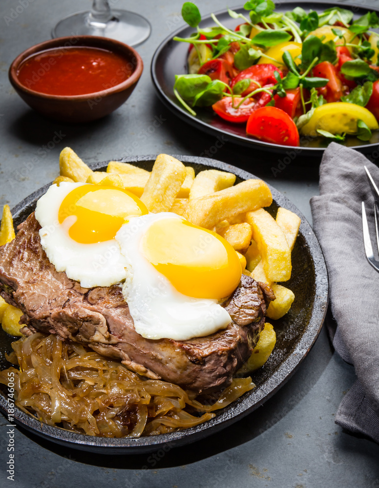 Peruvian Latin American food. Lomo a lo pobre. Beef tenderloin whit fried potatoes french fries and eggs