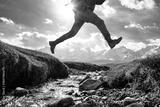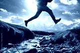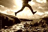 Close up photo of hikers legs jumping over small creek against snow capped mountains with glaciers. Travel active vacations concept