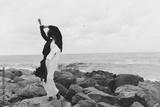 Dancer silhouette on a rocky coast, flowing dress catching wind, capturing graceful movement against the ocean horizon and dramatic monochrome scenery