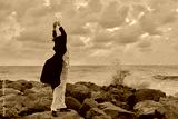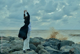 Figure in flowing dress and coat on a rocky shore, arms raised, wind lifting fabric, dramatic motion beside the sea and cloudy horizon, outdoor coastal scene with spray and movement