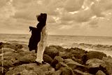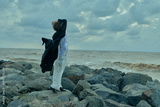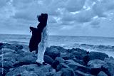 Fashion on rocky coast, windblown coat and white trousers by the sea, moody sky, dramatic silhouette as waves crash behind at dusk