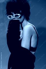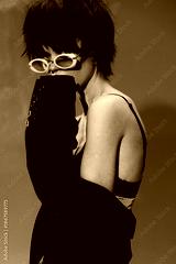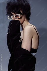 Stylish woman wearing sunglasses and black jacket posing against a dark background with a moody atmosphere.