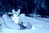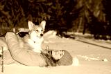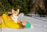 Playful corgi standing on smiling woman in snowy park winter pet bonding