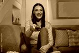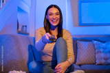Portrait of cheerful happy lady sitting on couch in cozy living room, watching TV show or movie with popcorn, pointing remote controller at camera