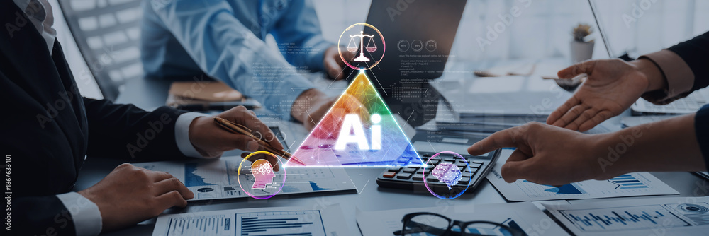 Business professionals discuss the integration of artificial intelligence into financial and legal analysis, showcasing collaboration and modern technology in the workplace. Trope
