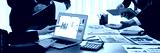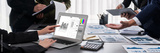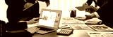 Panorama shot analyst team utilizing BI Fintech to analyze financial report with laptop. Businesspeople analyzing BI data dashboard displayed on laptop screen for business insight. Prodigy