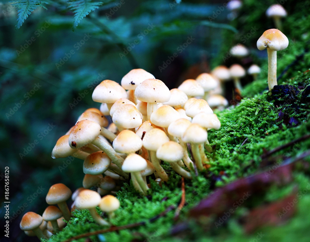 Hypholoma capnoides or conifer tuft mushrooms are clustered on a moss-covered piece of wood. The mushrooms have small, round, light brown to tan caps and slender, pale stems.