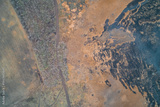 Country dirt road separating dry forest and burnt wetland grass, scorched earth texture, fire aftermath concept, aerial drone shot top view