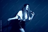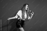 Excited young woman singing into a microphone on a vibrant red background, expressing joy and energy with stylish attire