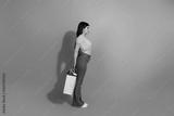 Young stylish brunette woman stands in profile with pink shopping bag against teal background
