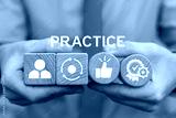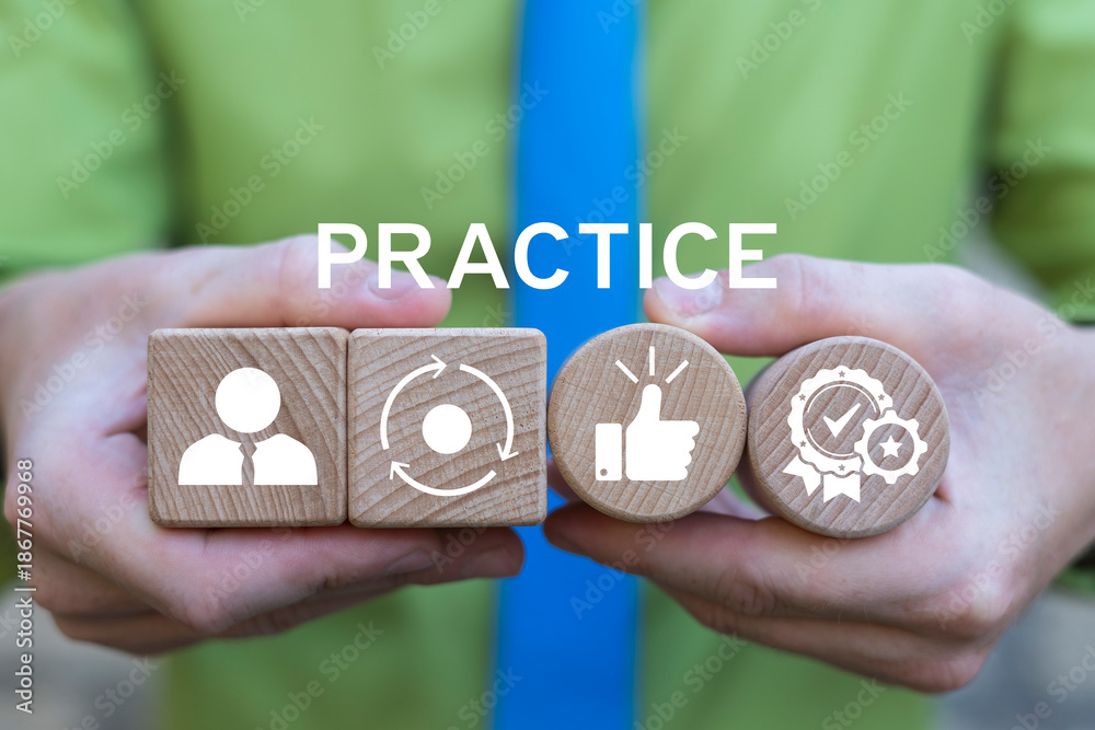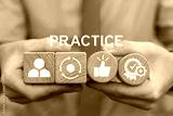 Best Practices Business Operations Management Efficiency Education concept. Business person holding wooden blocks with icons sees the word PRACTICE. Theory and Practice.