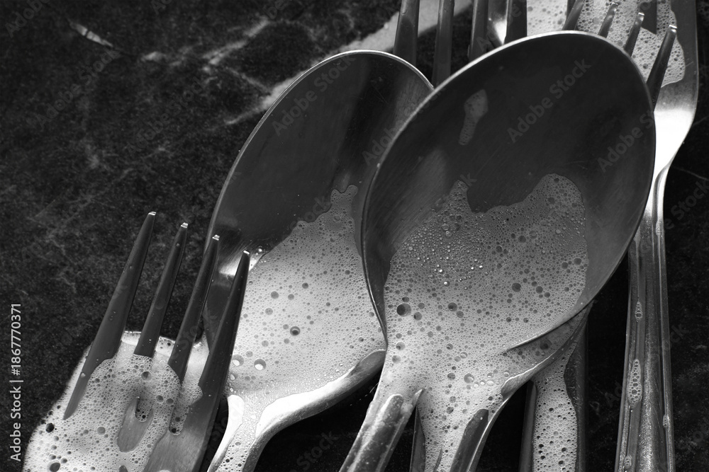 Dirty spoons and forks with bubbles dishwashing liquid soaking dishes.