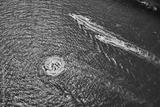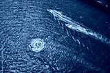 Aerial view of speed boat in motion.