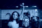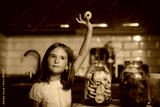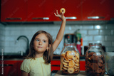 Little Girl Takes a Cookie Out of the Cookie Jar for Snacking. Naughty kid taking desserts from the jar instead of eating lunch