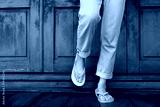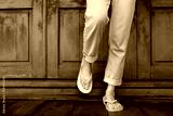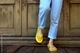 Yellow Flip Flops. Woman Legs and Feet Wearing Yellow Sandals Standing on Wooden Floor and wooden Wall Background Great for Any Use.