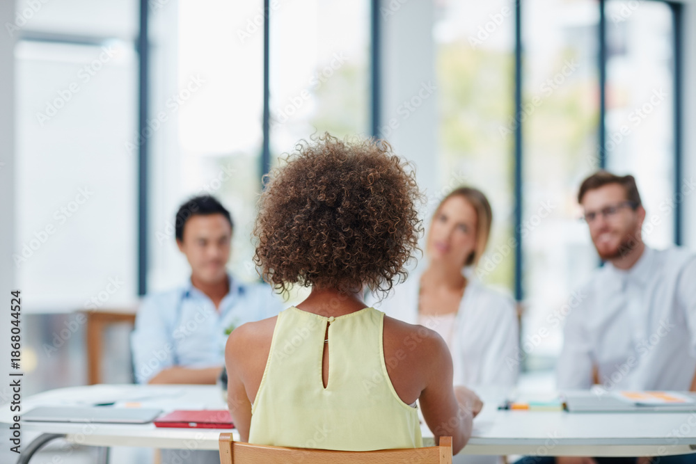 Discussion, job interview and businesswoman in office for recruitment, vacancy or hiring opportunity. Meeting, back and candidate with human resources team for onboarding process in workplace.