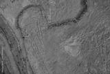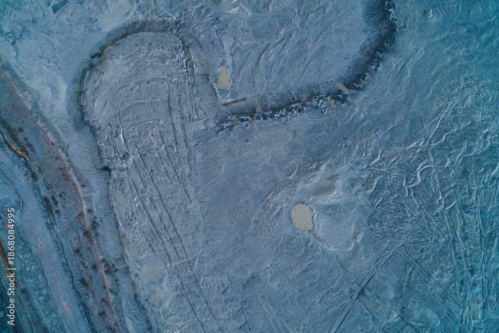 Blue frozen industrial sludge texture with flow patterns, abstract toxic waste background, cold winter landscape, aerial drone shot top view