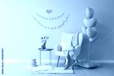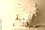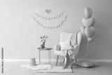 Interior of living room decorated for Valentine's Day with armchair, table and pink balloons