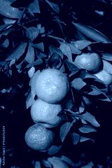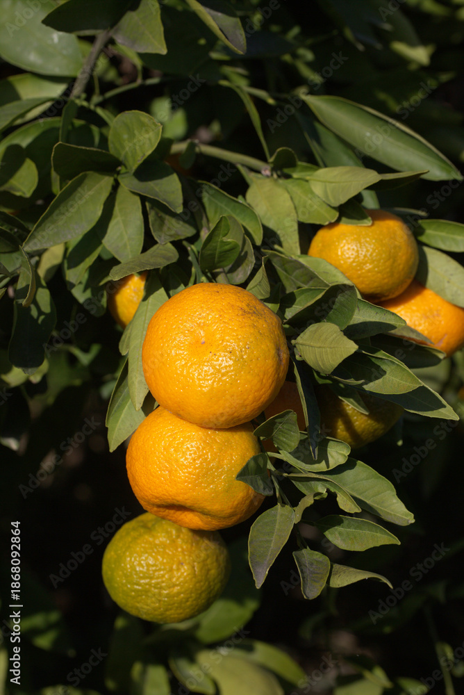 Close-up of ripe tangerines on the branches of trees on a sunny day.