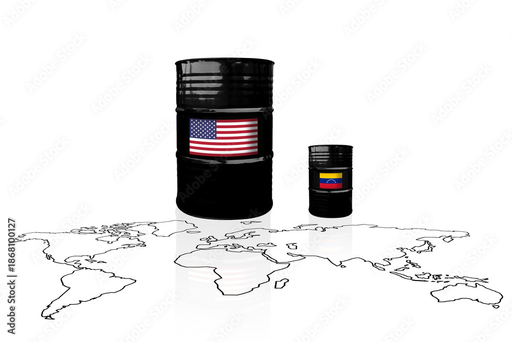 Crude oil barrels with USA and Venezuela flags on a world map