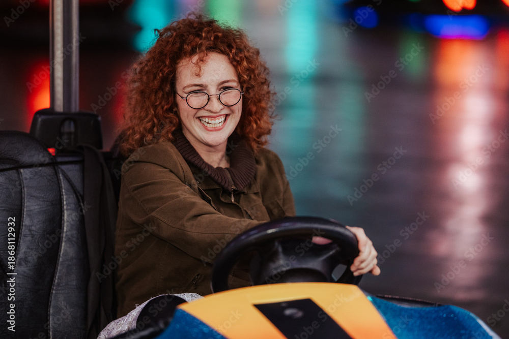Young woman having fun driving bumper car
