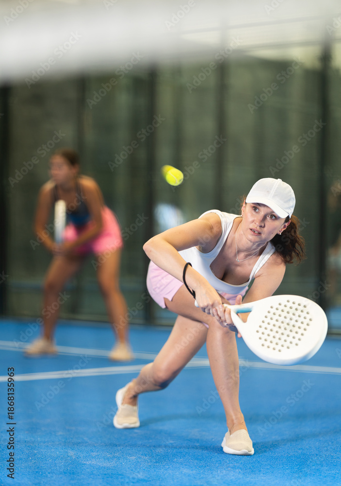Active woman with racket training on outdoor court playing padel game and hitting ball