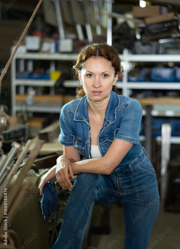 Portrait of confident female worker in workshop of a metallurgical plant