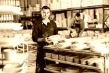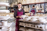 Young man in uniform posing with blanks of ceramic products in factory