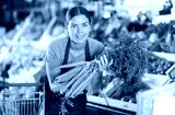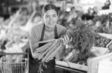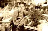 Smiling young female employee of natural foods store in green apron displaying bunch of fresh organic carrots while stocking produce on shelf, with blurred colorful background of vegetable stands..