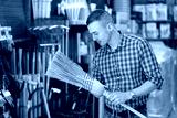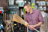 Male buyer carefully chooses broom in hardware store to clean the yard of her house