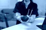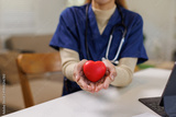 Nurse or research shows a person wearing blue medical scrubs and white latex gloves holding a bright red heart-shaped stress ball, symbolizing care and health.