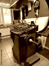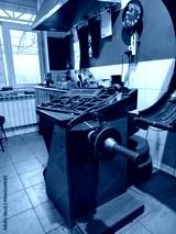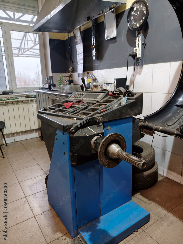 A machine stands in a garage used for balancing vehicle wheels. Tools and equipment are arranged on the workbench. Daylight enters through the window