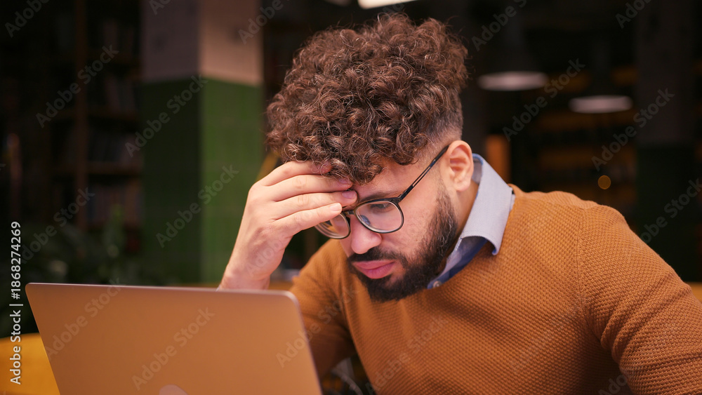 Sad male middle eastern worker, programmer working on laptop in modern coworking