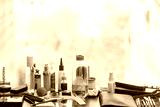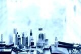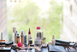 Set of various professional beauty products for makeup. Assorted makeup tools on a table by the window in a beauty salon